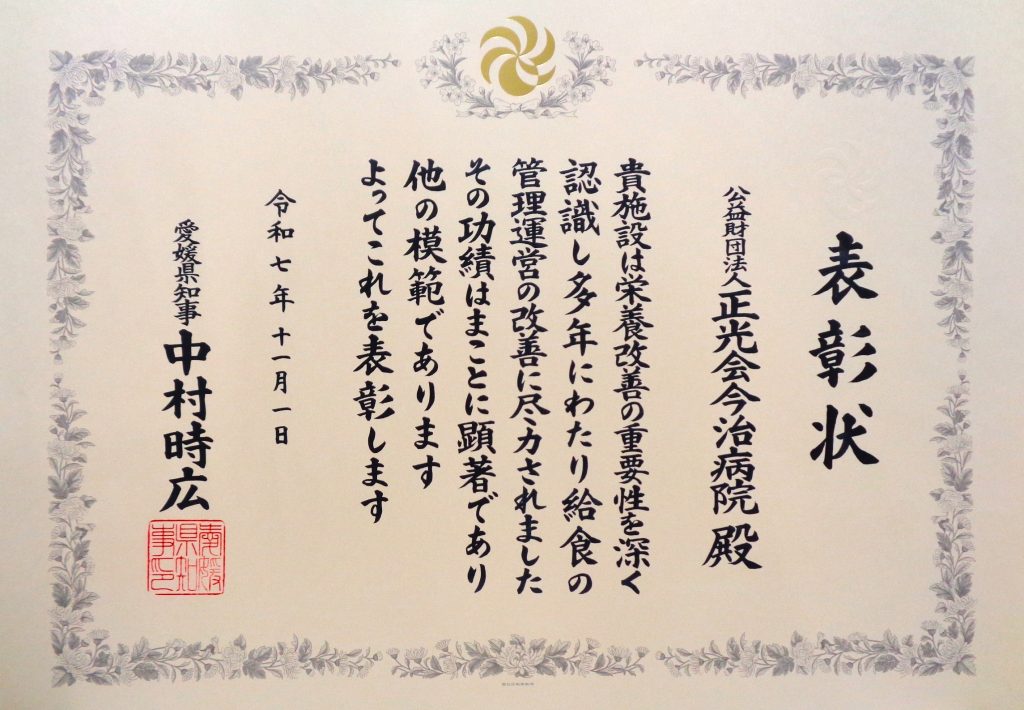 愛媛県より給食部門の管理運営を評価され表彰状をいただきました。